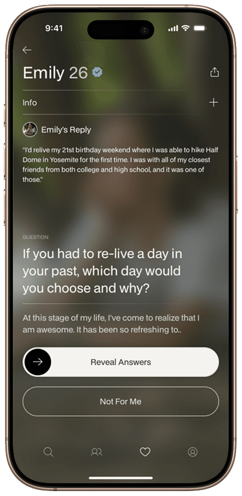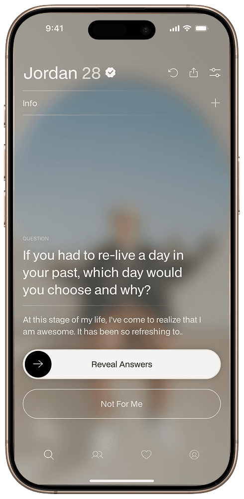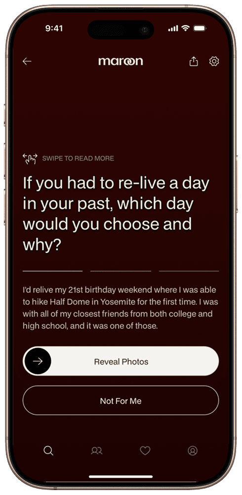 Maroon starts with you. We start with blurred photos. Then our science-backed prompts draw out the whole person; their authentic self, aspirations, and emotional intelligence to allow your choices to feel thoughtful. When alignment clicks, then you are able to reveal photos. This novel, researched flow reduces swipes, deepens conversations, and builds matches on shared values, not surface.